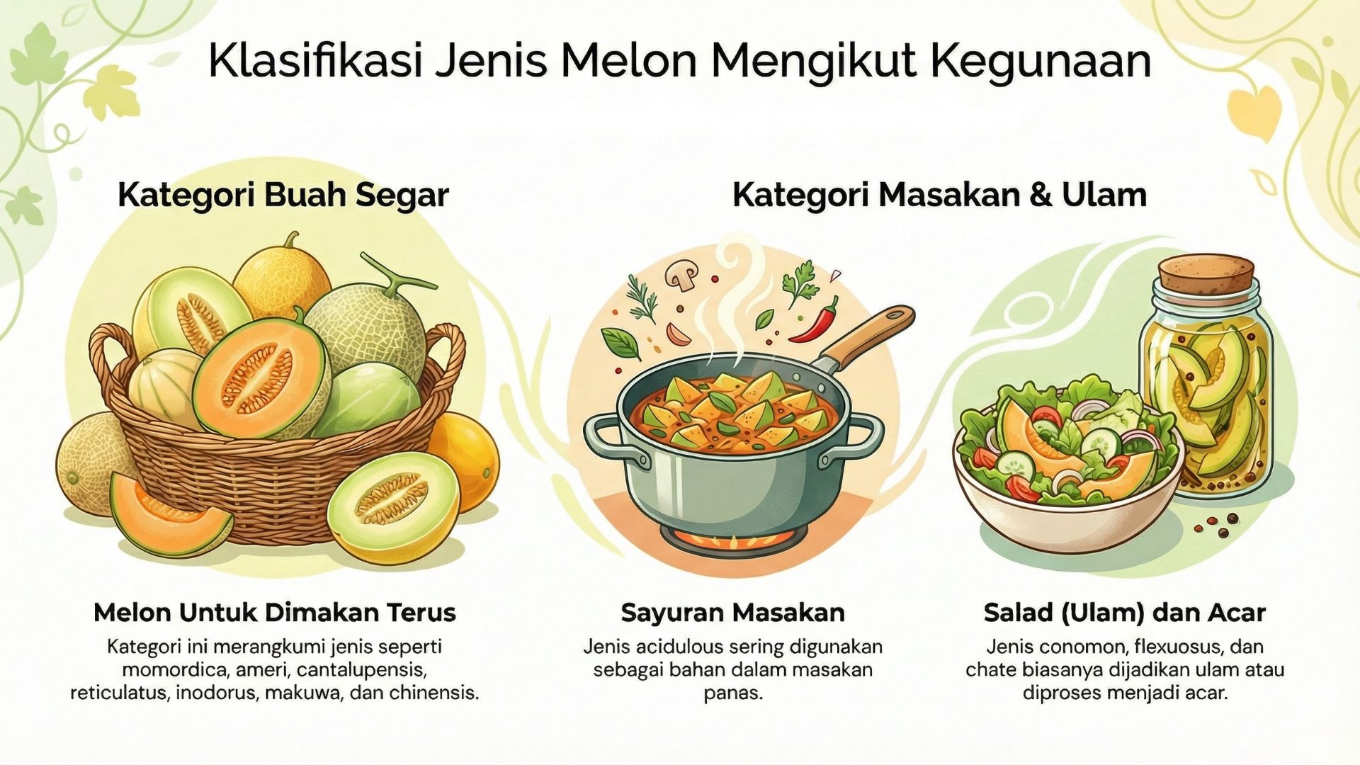 - Salad (Ulam) dan Acar: Varieti seperti conomon, flexuosus (sering dipanggil snake melon), dan chate adalah “hero” dalam kategori ini.