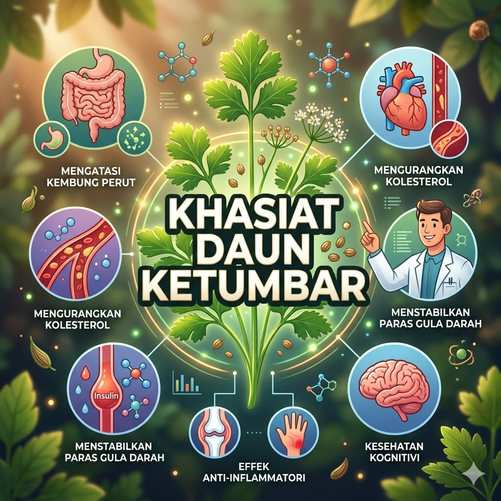 Daun ketumbar (Coriandrum sativum L.), yang juga dikenali sebagai cilantro atau coriander leaf, merupakan herba aromatik yang digunakan secara meluas dalam masakan serta perubatan tradisional di pelbagai rantau dunia. Selain nilai kulinarinya, daun ketumbar semakin mendapat perhatian dalam penyelidikan moden kerana kaya dengan minyak atsiri seperti linalool, ?-pinene dan limonene, di samping flavonoid, fenolat, karotenoid, vitamin C dan K, serta mineral seperti kalsium dan kalium. Gabungan sebatian ini dikaitkan dengan aktiviti antioksidan, anti-radang, antimikrob, kardioprotektif, sokongan metabolik, serta potensi neuroprotektif dan anxiolytic. Walaupun sebahagian besar bukti masih datang daripada kajian makmal dan haiwan, pola dapatan semasa agak konsisten dalam menunjukkan bahawa daun ketumbar berpotensi sebagai makanan fungsian yang menyokong kesihatan umum. Artikel ini meninjau kandungan bioaktif daun ketumbar, manfaat utama yang telah dilaporkan, hubungan dengan kegunaan tradisional, serta batasan bukti saintifik dan pertimbangan keselamatan semasa.