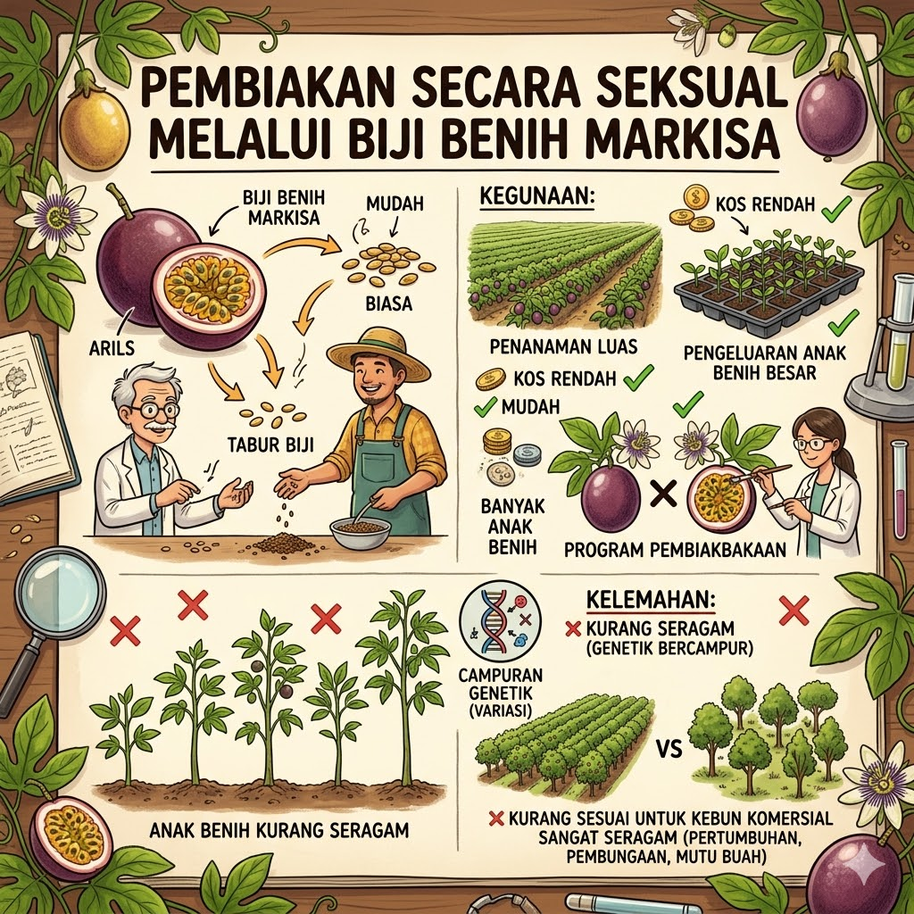 Tanaman markisa (Passiflora spp.) boleh dibiakkan melalui kaedah seksual dan aseksual, bergantung pada tujuan pengeluaran bahan tanaman, tahap keseragaman yang dikehendaki, tekanan penyakit di lapangan dan sumber teknologi yang tersedia. Kajian yang dirujuk menunjukkan bahawa pembiakan melalui biji masih menjadi kaedah paling mudah dan murah untuk penanaman luas, namun anak benih yang dihasilkan cenderung menunjukkan variasi sifat yang tinggi. Sebaliknya, kaedah vegetatif seperti keratan batang dan cantuman membolehkan penghasilan bahan tanaman yang lebih seragam, lebih cepat berbuah dan berpotensi lebih tahan terhadap penyakit tanah, kemarau atau saliniti apabila batang bawah yang sesuai digunakan. Di samping itu, kultur tisu, mikropropagasi, embriogenesis somatik dan cantuman in vitro semakin berkembang sebagai pendekatan moden untuk pengeluaran besar-besaran, penghasilan tanaman bebas penyakit dan pemuliharaan genetik. Secara keseluruhannya, pemilihan kaedah pembiakan markisa perlu dibuat berdasarkan objektif pengeluaran, keadaan persekitaran, tahap teknologi dan keperluan kualiti bahan tanaman, dengan pendekatan vegetatif dan bioteknologi semakin penting dalam sistem pengeluaran markisa komersial moden.
