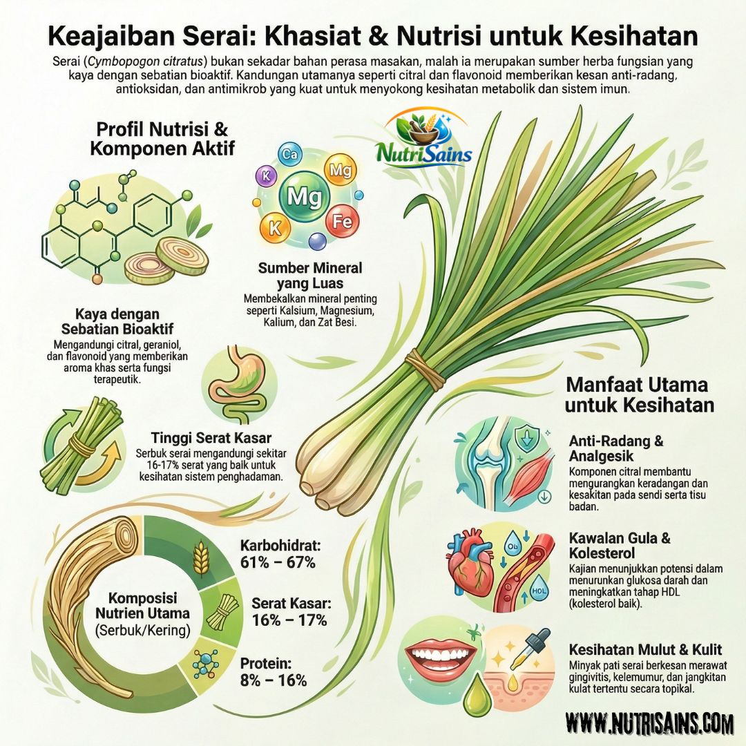Selama ini, kita mungkin menganggap serai (Cymbopogon citratus) hanya sebagai bahan sampingan untuk mewangi masakan seperti rendang atau tomyam. Namun, dari perspektif sains pemakanan, serai sebenarnya adalah herba fungsian yang kaya dengan sebatian bioaktif yang mampu menyokong kesihatan metabolik dan sistem imun badan.