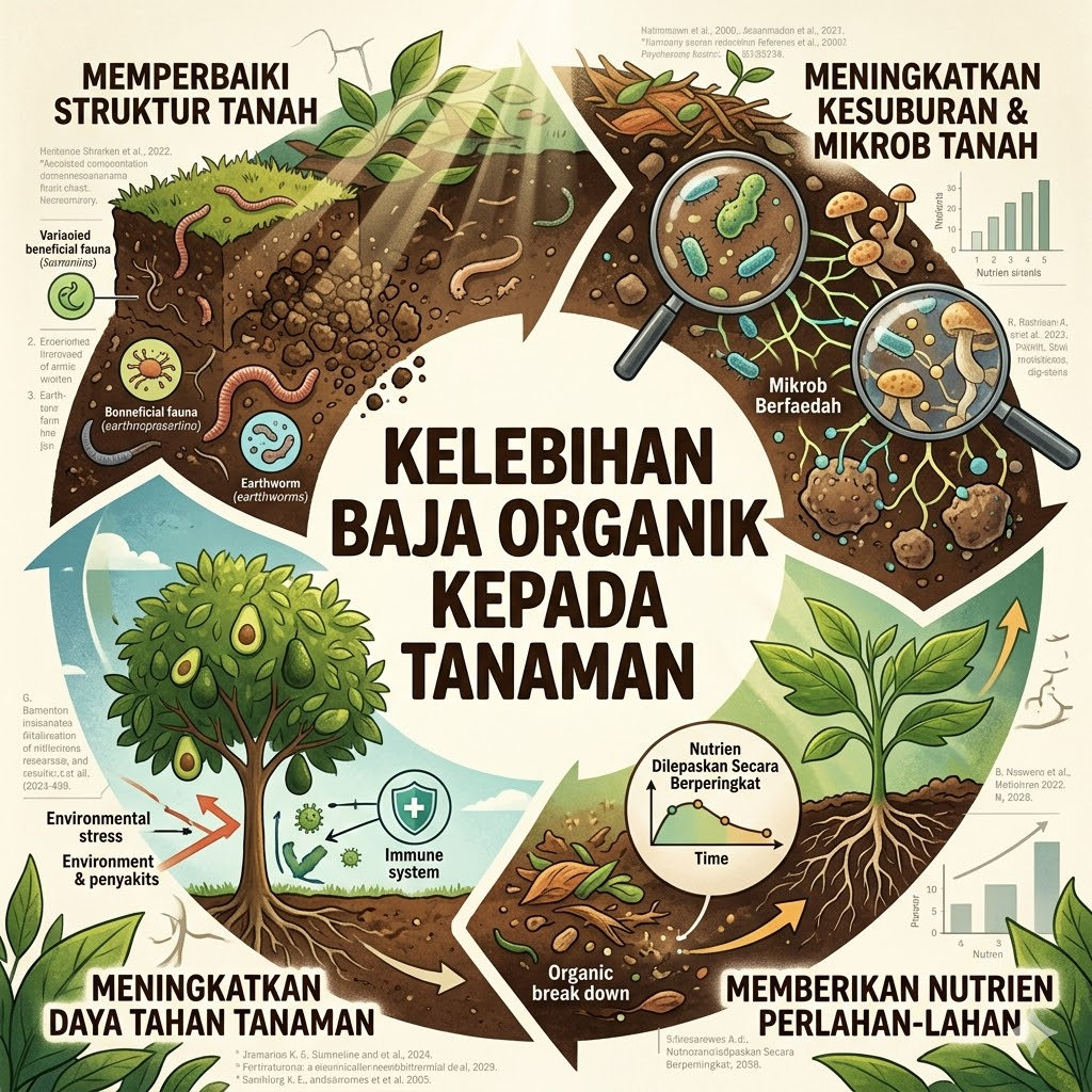 1. Memperbaiki Kualiti Fizikal, Kimia, dan Biologi Tanah Baja organik memainkan peranan yang sangat penting dalam memulihkan dan meningkatkan kesuburan tanah secara menyeluruh.