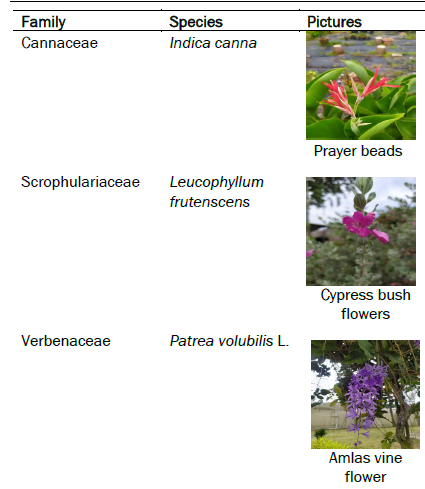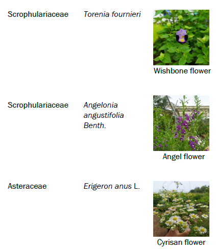 Kajian berjaya mengenal pasti 30 spesies bunga hiasan yang tergolong dalam 17 famili tumbuhan yang berbeza. Antara famili yang paling banyak diwakili ialah Nyctaginaceae dan Asteraceae, masing-masing menyumbang 26% dan 21% daripada jumlah keseluruhan spesies yang direkodkan.