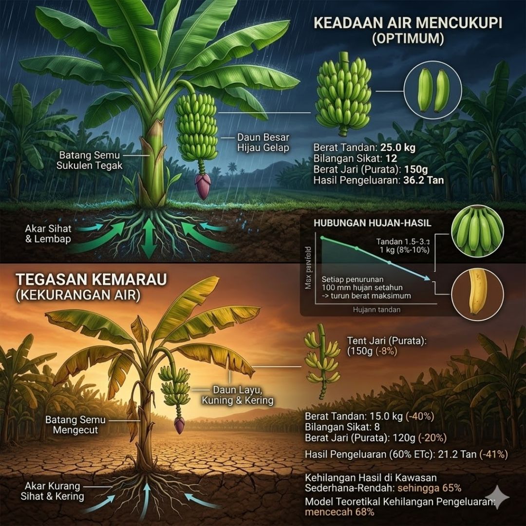 Ini menunjukkan bahawa pengurusan pengairan yang cekap amat penting bagi memastikan kestabilan hasil tanaman pisang, khususnya di kawasan yang mempunyai taburan hujan yang tidak menentu.