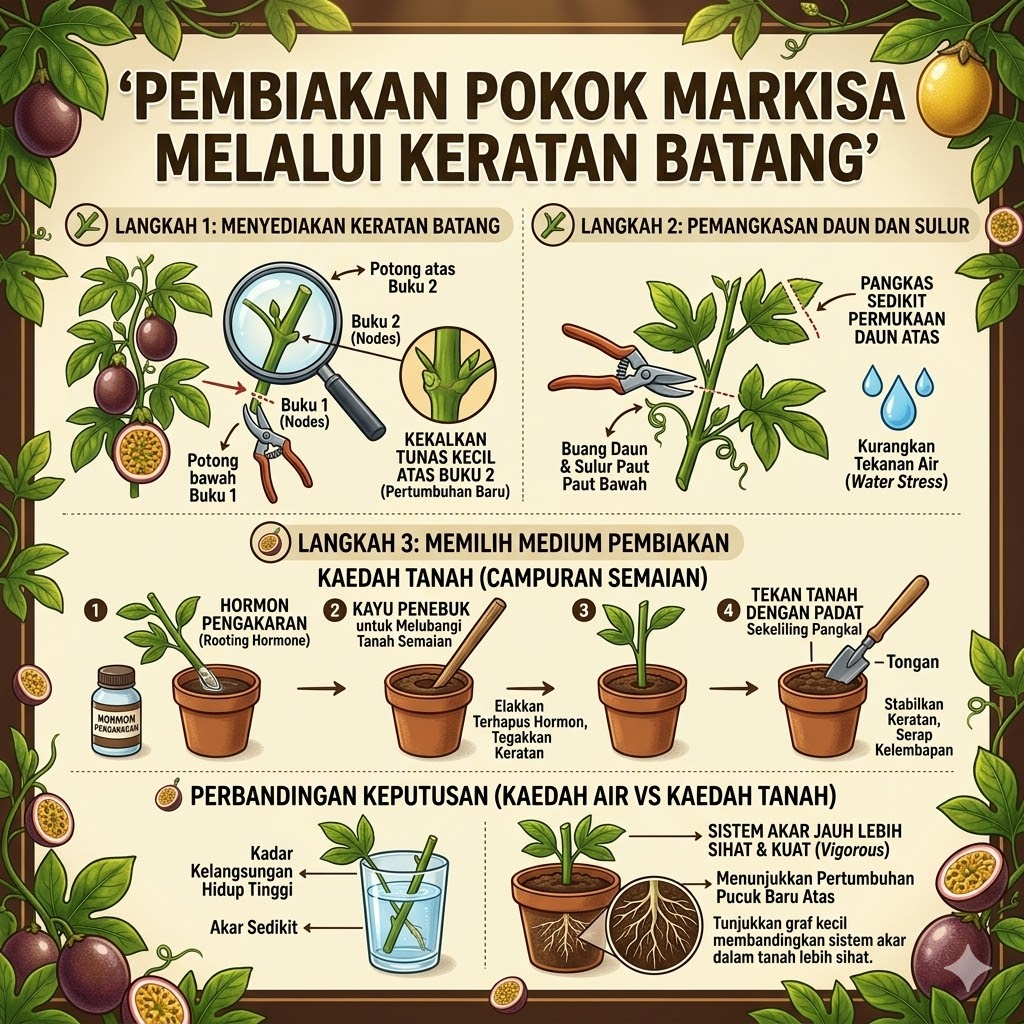 Berikut adalah langkah demi langkah untuk membiakkan pokok markisa menggunakan kaedah keratan batang berdasarkan sumber yang disediakan: