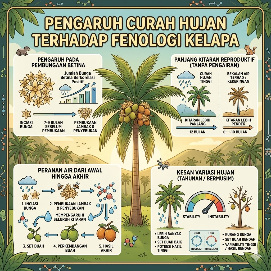 Curah hujan ialah salah satu faktor iklim terpenting yang mempengaruhi fenologi kelapa. Kajian yang dirujuk menunjukkan bahawa jumlah bunga betina per jambak berkorelasi positif dengan curah hujan sekitar 7 hingga 9 bulan sebelum pembukaan jambak. Di samping itu, dalam keadaan tanpa pengairan, panjang kitaran reproduktif cenderung menjadi lebih panjang apabila curah hujan tinggi dan lebih pendek apabila bekalan air terhad. Ini menunjukkan bahawa air memainkan peranan sejak peringkat inisiasi bunga hingga perkembangan buah. Oleh itu, variasi hujan tahunan atau bermusim boleh memberi kesan besar terhadap bilangan bunga, kejayaan set buah dan potensi hasil akhir pokok kelapa.