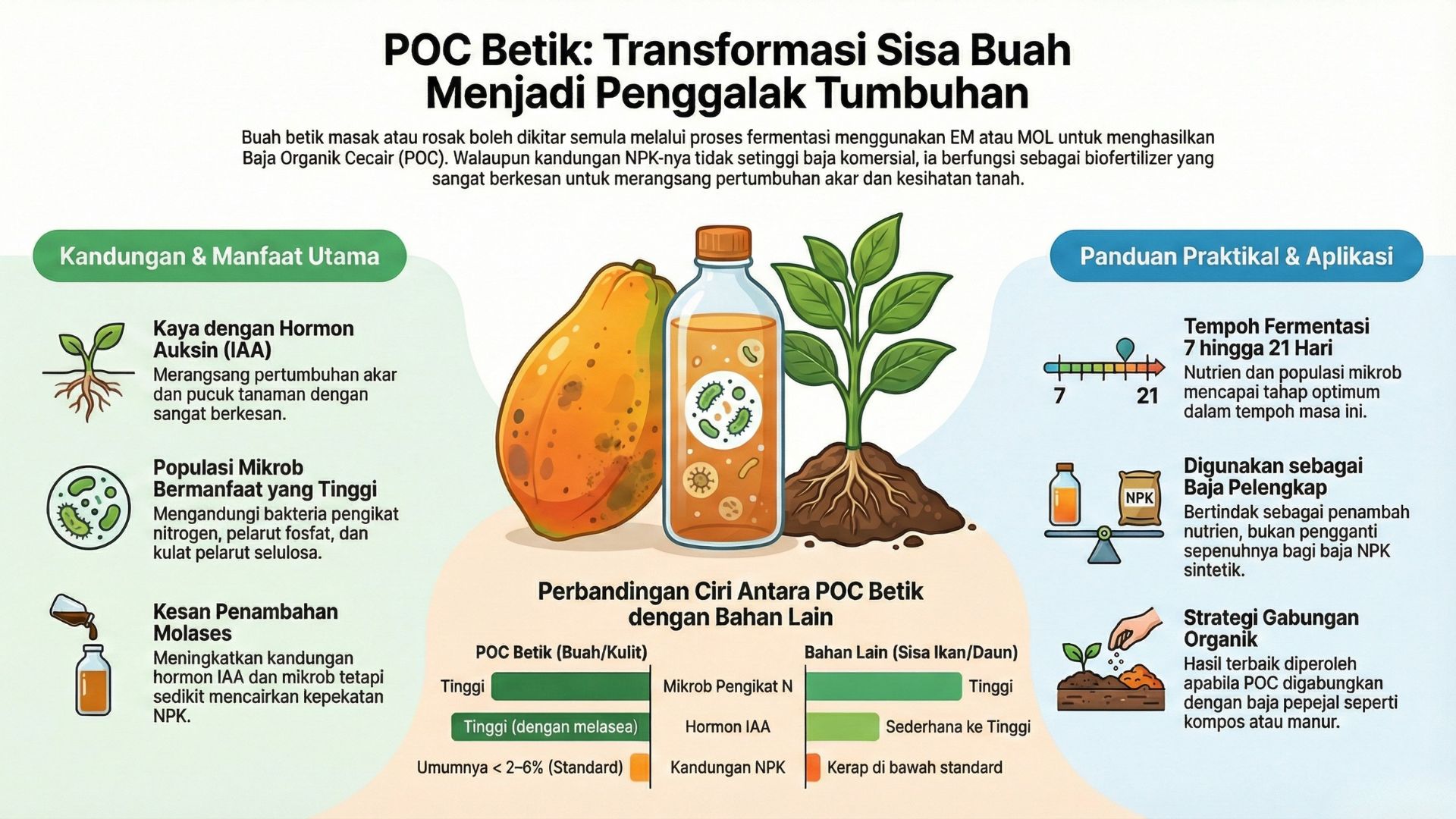 Transformasi sisa buah menjadi Baja Organik Cecair (POC) bukan sekadar trend kitar semula, ia adalah satu proses fermentasi yang menghasilkan biofertilizer yang sangat efektif. Jom kita bedah kenapa POC betik patut ada dalam senarai penjagaan tanaman anda.
