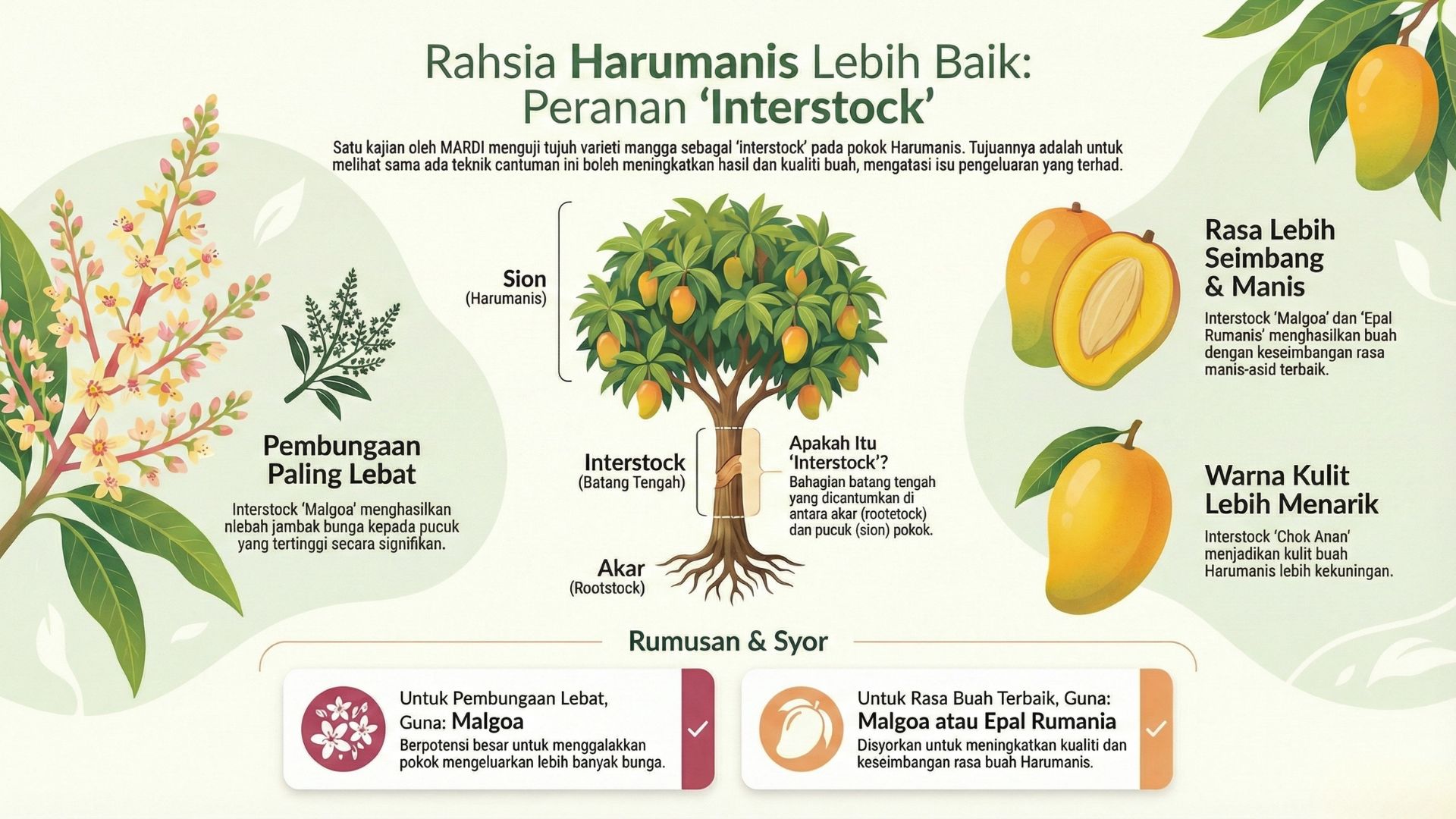 Teknik interstock membuktikan bahawa inovasi dalam grafting technology mampu mengatasi isu pengeluaran yang terhad. Dengan memilih kombinasi genetik yang betul, kita bukan sahaja dapat meningkatkan kuantiti buah, malah memastikan setiap biji Harumanis yang sampai ke tangan pengguna adalah pada tahap kualiti yang tertinggi.